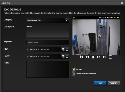 Tags may be created in simple format (as shown above) with a brief description, category association and Public/Private flag or in an Advanced mode. In advanced mode, users may add one or multiple keywords, notify another user, and create a video extraction from the same dialog box.