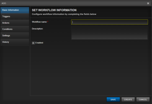 Configuration of Workflows: From the Administration Module select the Workflow container from the left side panel. Select “ADD” to initiate the configuration process. The configuration tabs consist of 6 components: Workflow Information, Triggers, Actions, Conditions, settings, and History. . Illustrated below are the required Workflow component tabs with a brief description.